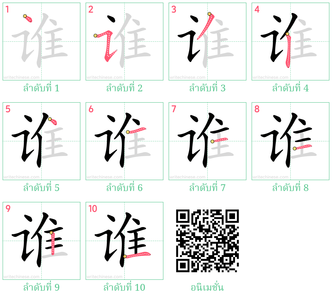 เรียนรู้การเขียนอักษรจีน "谁" โดยการดูภาพเคลื่อนไหวของลำดับการเสียบเส้นของ "谁"