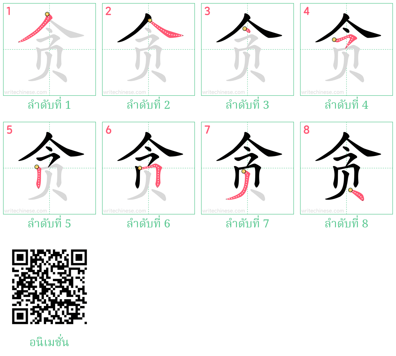 เรียนรู้การเขียนอักษรจีน "贪" โดยการดูภาพเคลื่อนไหวของลำดับการเสียบเส้นของ "贪"