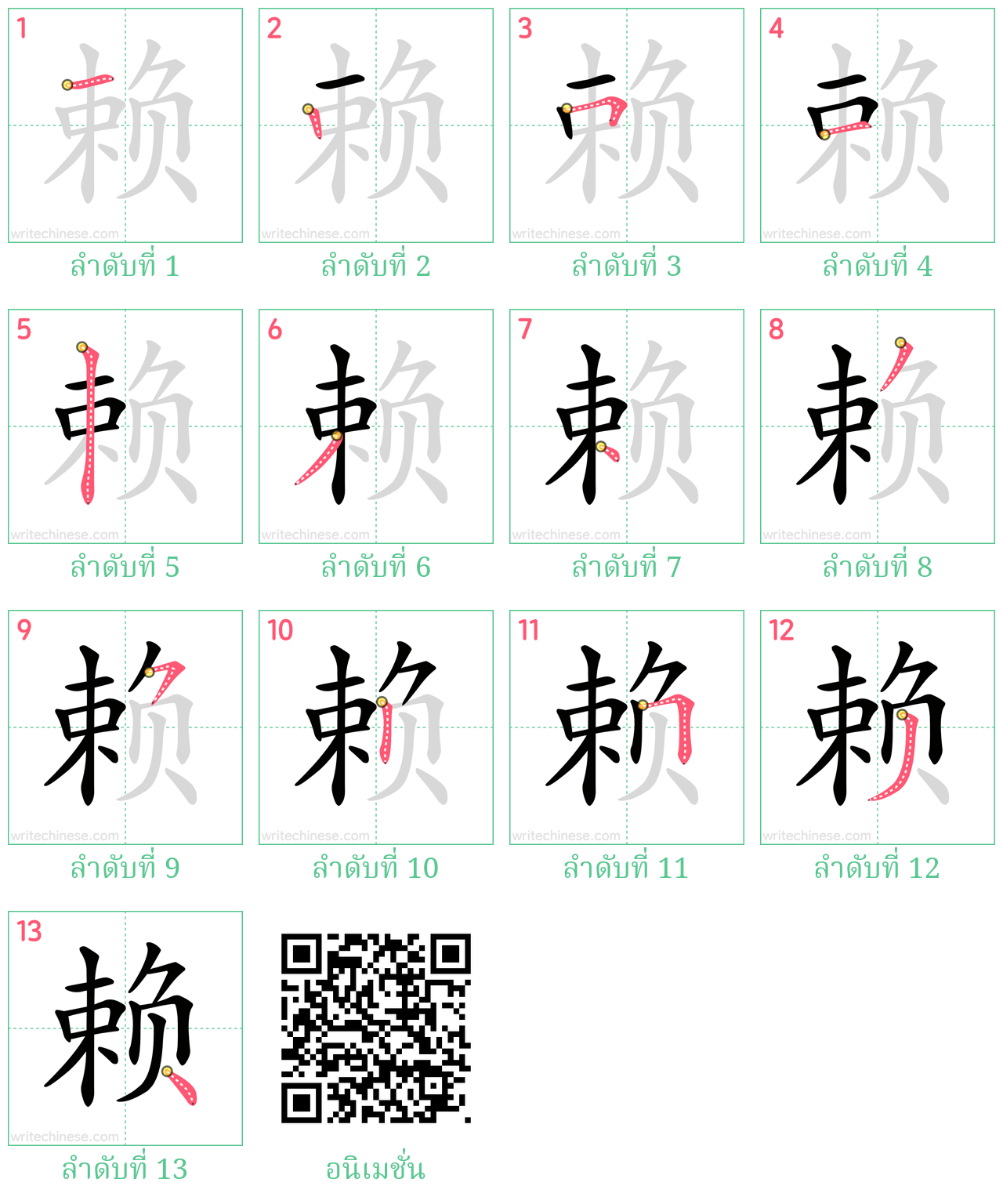 เรียนรู้การเขียนอักษรจีน "赖" ขีดละขีดด้วยคำแนะนำขั้นตอนที่ชัดเจน