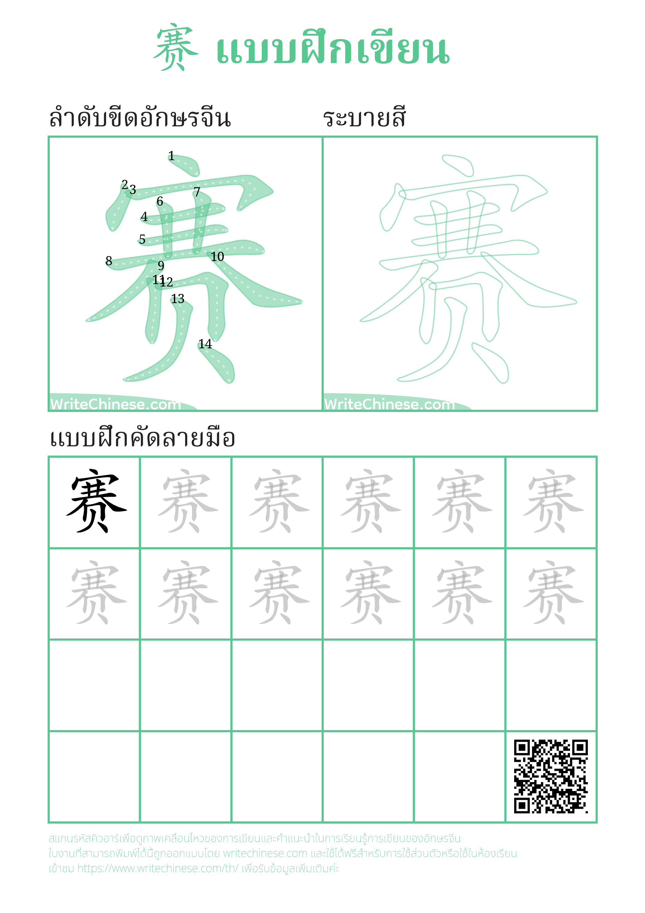แผ่นงานฝึกฝนลำดับการเขียนตัวอักษรจีน 赛 ที่สามารถพิมพ์ได้