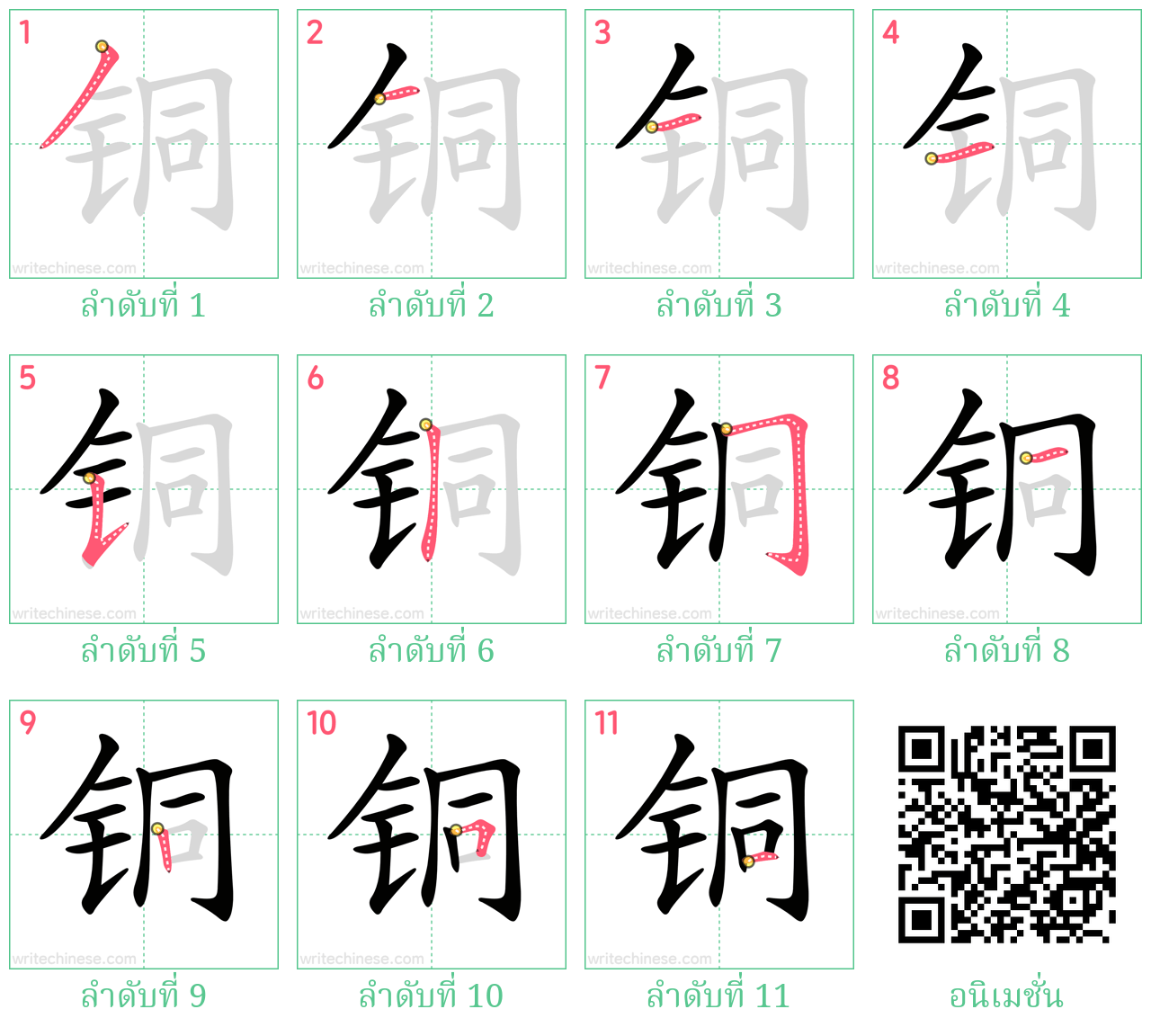 เรียนรู้การเขียนอักษรจีน "铜" โดยการดูภาพเคลื่อนไหวของลำดับการเสียบเส้นของ "铜"