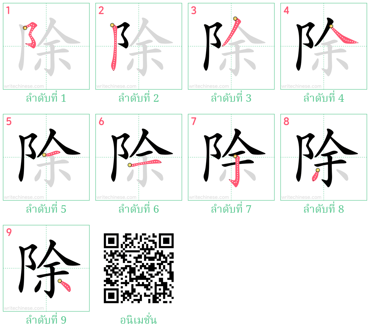 เรียนรู้การเขียนอักษรจีน "除" โดยการดูภาพเคลื่อนไหวของลำดับการเสียบเส้นของ "除"